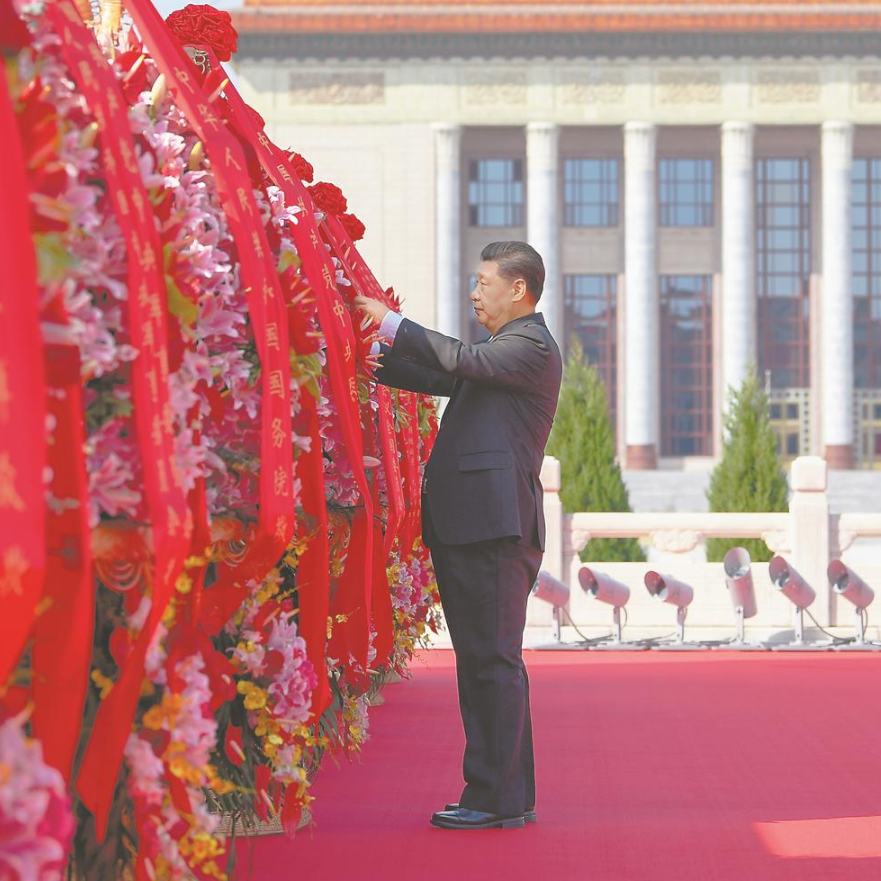 ?9月30日上午,黨和國家領(lǐng)導(dǎo)人習(xí)近平、李克強(qiáng)、栗戰(zhàn)書、汪洋、王滬寧、趙樂際、韓正、王岐山等來到北京天安門廣場(chǎng),出席烈士紀(jì)念日向人民英雄敬獻(xiàn)花籃儀式。這是習(xí)近平整理花籃上的緞帶。 新華社記者 申宏 攝