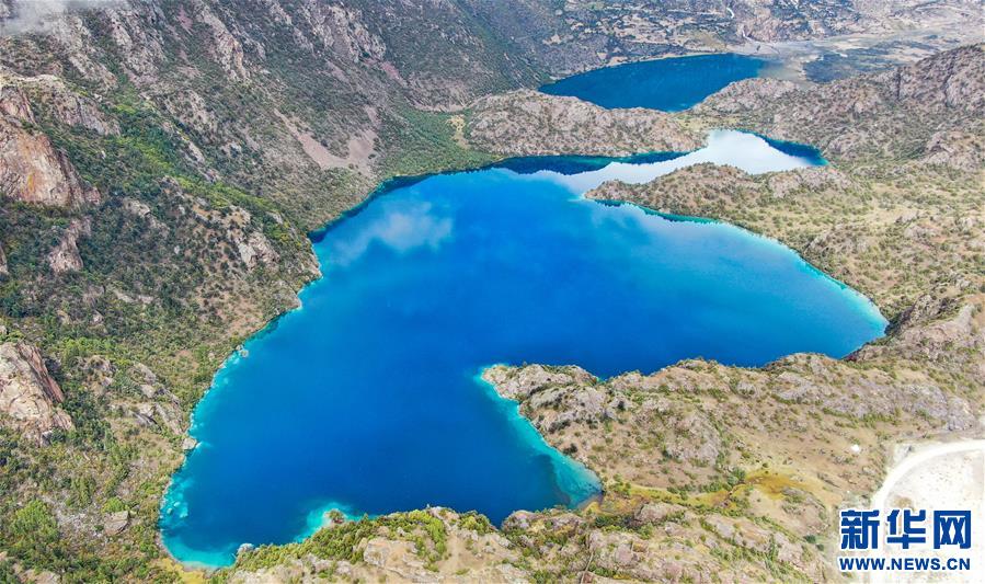 三色湖”中被稱為黑湖的湖水,近觀呈黑色,而從空中俯瞰,則更多呈現(xiàn)明亮的藍(lán)(9月26日攝,無人機(jī)照片)。新華社記者 晉美多吉 攝