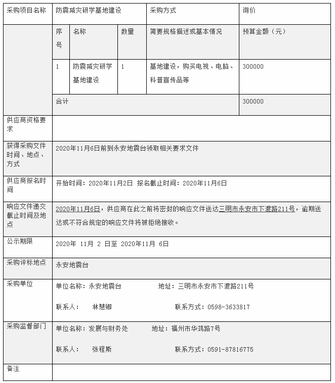 依據(jù)《福建省地震局采購管理實(shí)施細(xì)則》要求,現(xiàn)對永安地震臺“防震減災(zāi)研學(xué)基地建設(shè)”進(jìn)行公開采購,現(xiàn)歡迎有意向、合格的供應(yīng)商前來參加。