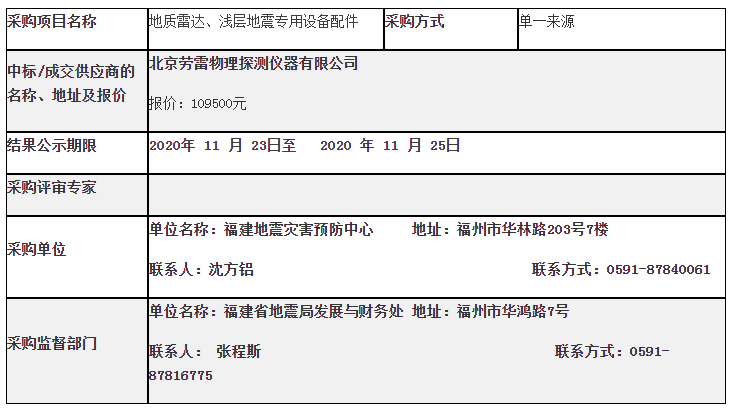 地震災(zāi)害預(yù)防中心2020年地質(zhì)雷達(dá)、淺層地震專(zhuān)用設(shè)備配件采購(gòu)結(jié)果公告