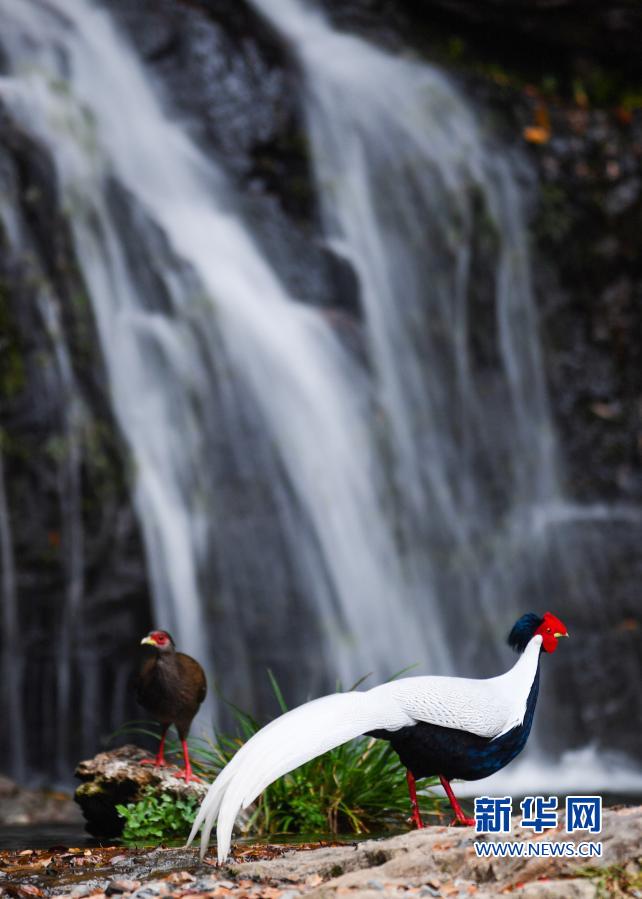 在永安市青水畬族鄉(xiāng)豐田村,兩只白鷴在瀑布前休憩(11月21日攝)。