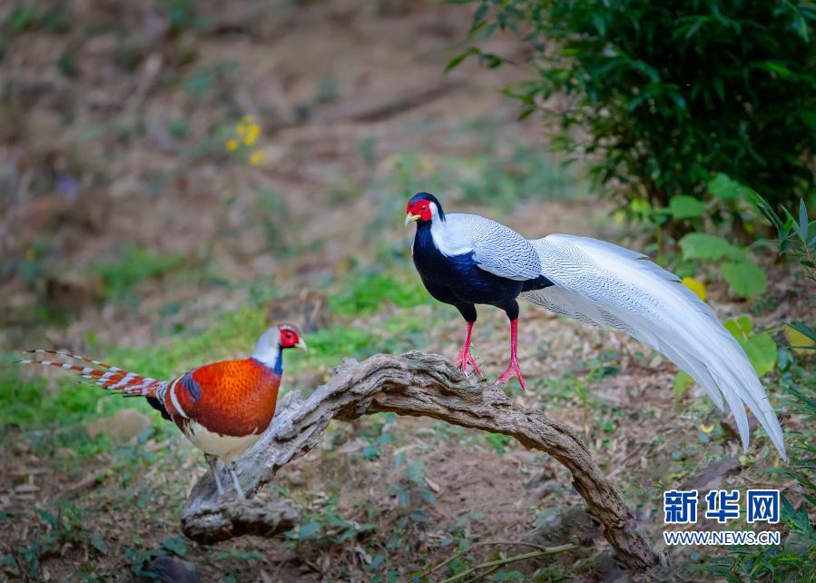 在永安市青水畬族鄉(xiāng)豐田村,白鷴(右)與白頸長尾雉相伴在林邊休憩(11月21日攝)。新華社記者 梅永存 攝 |