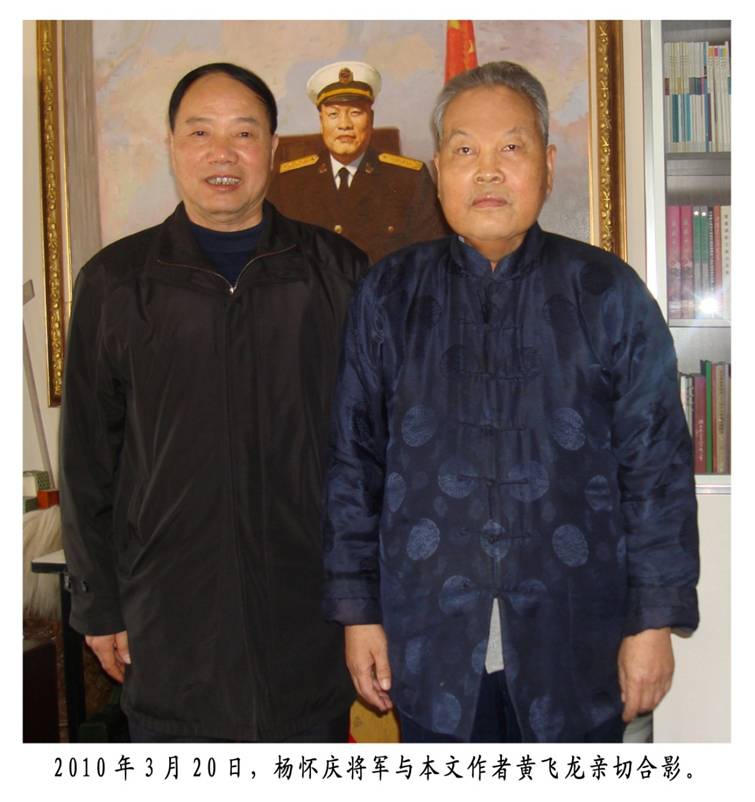 彼此牽掛 情真意切 1984年6月,我調(diào)福建基地干部處工作。翌年8月,楊懷慶部長(zhǎng)也離開了他軍旅生涯工作時(shí)間長(zhǎng)達(dá)15年之久的東海艦隊(duì)干部部,先后到舟山基地和海政、海軍領(lǐng)導(dǎo)崗位上任職。雖然與老首長(zhǎng)地域相隔越來(lái)越遙遠(yuǎn),但我和首長(zhǎng)之間始終保持著不間斷的聯(lián)系和交往,關(guān)系越來(lái)越親近,感情越來(lái)越深厚,彼此相互牽掛著對(duì)方。長(zhǎng)期的相處交往,使我從他那里得到許多教益,從他身上學(xué)到許多難能可貴的東西和細(xì)潤(rùn)無(wú)聲的高尚品德。 楊懷慶同志生前曾多次到過福建,他對(duì)福建這片擁軍熱土懷有一股深情,又特別記掛我這個(gè)曾經(jīng)的老部下。每每到福建,老首長(zhǎng)總會(huì)惦記召見我,與我促膝長(zhǎng)談,了解基層部隊(duì)的有關(guān)動(dòng)態(tài),詢問我到福建后的工作、學(xué)習(xí)和家庭狀況,關(guān)心我的成長(zhǎng)進(jìn)步,鼓勵(lì)我繼續(xù)為部隊(duì)建設(shè)和地方發(fā)展多做貢獻(xiàn)。 1989年5月底,時(shí)任舟山基地政委的楊懷慶與司令員王永國(guó)率艦船編隊(duì)到三都與福建基地部隊(duì)舉行海上演練。29日上午,他電召當(dāng)時(shí)在福建基地政治部(地處飛鸞)工作的我,約我到三都礁頭面談。記得當(dāng)時(shí)他謝絕了其他干部求見,與我談了整整一個(gè)上午。他詢問了我個(gè)人的工作生活和家庭情況后,了解了福建基地部隊(duì)和干部情況。他特別對(duì)當(dāng)時(shí)的熱點(diǎn)問題很感興趣,與我探討交流市場(chǎng)經(jīng)濟(jì)條件下部隊(duì)思想政治工作面臨的問題:如軍地收入反差對(duì)干部的沖擊;地處僑鄉(xiāng)和改革開放地區(qū)部隊(duì)受燈紅酒綠的影響以及多元文化侵蝕的問題;青年學(xué)生官帶兵能力不足的問題。他還非常耐心地征求我對(duì)如何加強(qiáng)和改進(jìn)在改革開放新形勢(shì)下做好部隊(duì)思想政治工作的意見。楊政委總是以平等的口吻與我探討問題,注意傾聽我的看法,只把我當(dāng)做戰(zhàn)友和知心朋友對(duì)待,更讓我油然而生敬意。 2000年3月24日,我當(dāng)時(shí)正參加莆田市機(jī)關(guān)第二批“三講”,楊政委來(lái)福建視察工作要召見我,并特地交待楊野平秘書,叫我把妻子方美珠和女兒黃方也帶上福州。我向市委請(qǐng)假后,當(dāng)晚帶妻子、女兒上福州,到福海賓館時(shí),總臺(tái)服務(wù)員說,楊政委交待,把你們一家人安排住6樓首長(zhǎng)隔壁間。我們感到莫大的榮幸。當(dāng)晚首長(zhǎng)會(huì)見我和家人并合影留念,還和我長(zhǎng)談到深夜。 次日晨,首長(zhǎng)還叫我一起散步。早飯后,楊政委親自從6樓下來(lái)送我們上車。此情此景,感人至深。 2007年8月底,老首長(zhǎng)在廈門鼓浪嶼療養(yǎng)院療養(yǎng),得知我要去探望他,冒著烈日酷暑,抱病早早就在離居室約300米處的地方迎候我,臨走時(shí)還把我和另一位曾在艦隊(duì)干部部工作過的周金龍戰(zhàn)友一直送到鼓療門口,令我們感動(dòng)不已。 2008年7月25日中午,我赴廈門水警區(qū)拜訪正在休養(yǎng)的楊將軍,到達(dá)后,他正在午休。老首長(zhǎng)起床后,聽姚樹彬秘書說我來(lái)見他,立即召見我。他因左耳聽力下降,叫我靠近點(diǎn)坐在他的右側(cè),對(duì)我說:“飛龍,今天我要考考你,看你腦瓜還靈不靈?!彼幌伦舆B續(xù)問了10多位曾在艦隊(duì)干部部工作過的老戰(zhàn)友愛人的姓名,我一個(gè)個(gè)作了回答,沒出差錯(cuò)。問答后,他幽默風(fēng)趣地對(duì)一同前來(lái)探望他的水警區(qū)政委趙閩陽(yáng)等人說:“看來(lái)飛龍你這個(gè)腦瓜還管用,沒有故障,你記性還好,過去我??淠汶娔X,看來(lái)還沒生銹,不錯(cuò)?!币幌?,說得大家哄堂大笑。爾后,楊將軍很興奮地親自招呼大家與他合影留念(見圖九)。 在離開艦隊(duì)干部部后,我也十分想念老首長(zhǎng),曾多次電話、書信或面見首長(zhǎng)。我1997年底擬定轉(zhuǎn)業(yè)和1998年8月轉(zhuǎn)到地方工作后,尤其是在楊懷慶將軍病重、病危時(shí),先后于1997年12月21日、1998年11月14日、2006年6月22日、2010年3月20日、2012年2月22日共5次前往北京看望老首長(zhǎng)。彼此牽掛、相互探訪,而每次的重逢會(huì)面,首長(zhǎng)總是喜出望外、談笑風(fēng)生、挽留共餐、合影留念;離別時(shí),也總是依戀不舍,熱情歡送。
