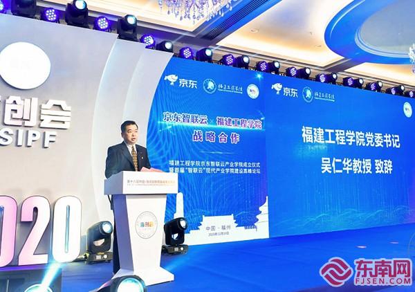吳仁華致辭。東南網(wǎng)記者 陳楠 攝 東南網(wǎng)12月10日訊(本網(wǎng)記者 陳楠)今天上午,作為第十八屆“海創(chuàng)會”配套活動的福建工程學院京東智聯(lián)云產(chǎn)業(yè)學院成立儀式暨首屆“智聯(lián)云”現(xiàn)代產(chǎn)業(yè)學院建設(shè)高峰論壇在福州市開幕。 記者在會上獲悉,此次雙方聯(lián)合成立的福建工程學院京東智聯(lián)云產(chǎn)業(yè)學院將致力于開展產(chǎn)教融合創(chuàng)新示范,在電商、貿(mào)易、物流供應(yīng)鏈、人工智能等領(lǐng)域建立長效穩(wěn)固的合作機制,加快福建省該領(lǐng)域應(yīng)用型人才培養(yǎng)。學院依托于互聯(lián)網(wǎng)經(jīng)貿(mào)學院,開設(shè)電子商務(wù)行業(yè)工程師實驗班,并整合線下線上教學資源等多種教學模式。目前學院現(xiàn)有富民云咖新媒體產(chǎn)教融合基地、互聯(lián)網(wǎng)創(chuàng)客中心等校內(nèi)實踐平臺,以及可利用的京東(福清)電商產(chǎn)業(yè)園、京東(仙游)數(shù)字經(jīng)濟產(chǎn)業(yè)園、京東(廈門)電子商務(wù)產(chǎn)業(yè)園等多個省內(nèi)實踐平臺,引入產(chǎn)業(yè)知識與技能入課堂,打造理論與實踐無縫對接的學習模式。
