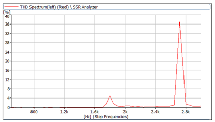 本次諧波失真全部滿足標(biāo)準(zhǔn)要求,但是并非所有滿足標(biāo)準(zhǔn)要求的耳機主觀聽感就好,這是由于標(biāo)準(zhǔn)中允許小于三分一倍頻程的失真峰存在。例如下圖中,雖然諧波失真滿足標(biāo)準(zhǔn)要求,但是失真峰最高達(dá)到了36%,如果音樂頻段集中在這個頻段,主觀聽音效果是非常差的。