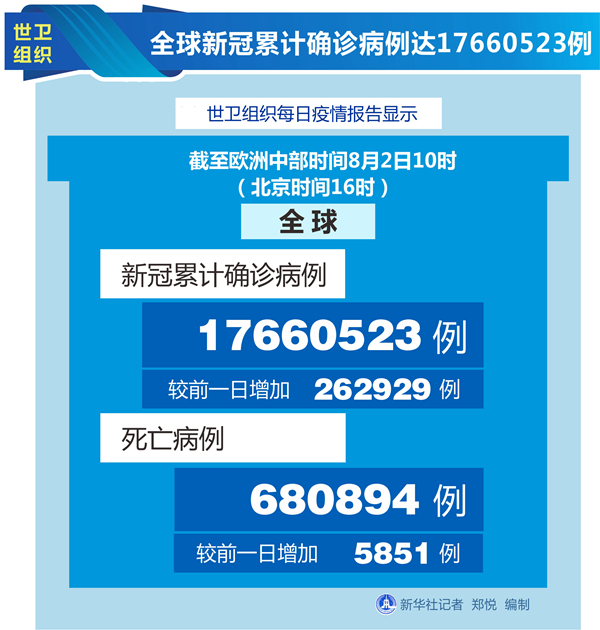 世衛(wèi)組織每日疫情報告顯示,截至歐洲中部時間2日10時(北京時間16時),全球確診病例較前一日增加262929例,達(dá)到17660523例;死亡病例增加5851例,達(dá)到680894例。