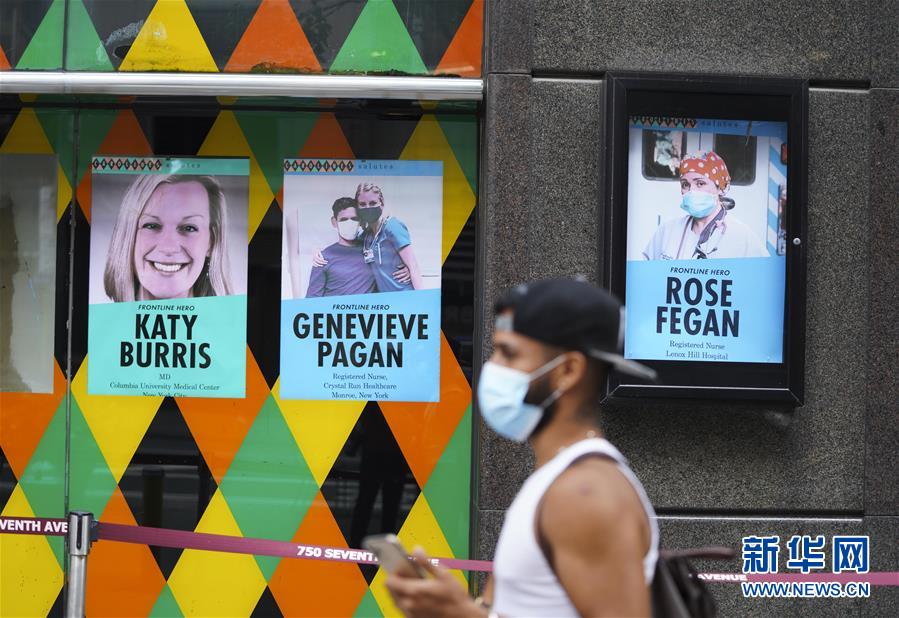 8月19日,在美國(guó)紐約,一名行人從街頭向醫(yī)護(hù)人員致敬的廣告牌旁走過(guò)。 新華社記者 王迎 攝 |