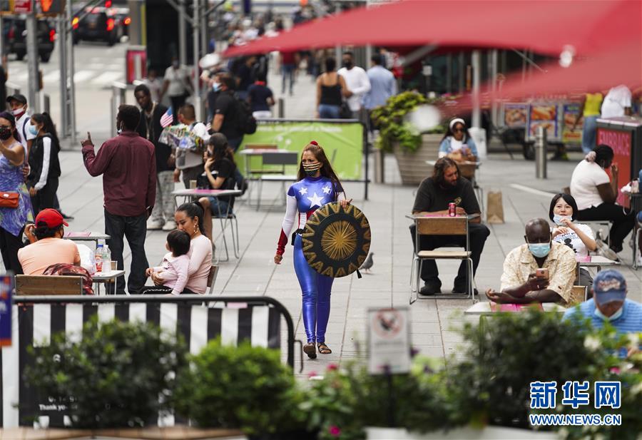 8月19日,一名街頭表演者在美國(guó)紐約時(shí)報(bào)廣場(chǎng)招攬顧客。 新華社記者 王迎 攝