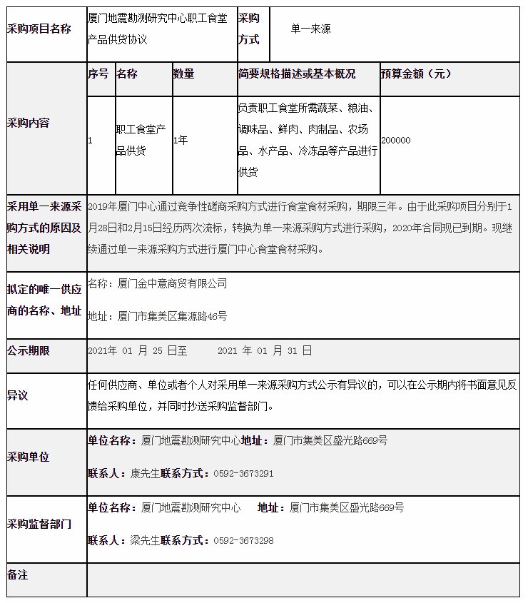 廈門地震勘測研究中心職工食堂產(chǎn)品供貨采用單一來源采購公示
