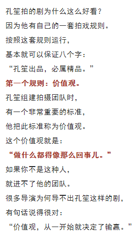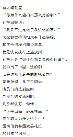 孔笙帶著幾名弟子離開山東影視集團(tuán), 然后創(chuàng)辦了東陽正午陽光影視公司。 在正午陽光這個團(tuán)隊里, 大家也都認(rèn)可一句話: “制片人候鴻亮是事務(wù)性領(lǐng)袖, 而導(dǎo)演孔笙是精神領(lǐng)袖?!?/span> 正午陽光能拍出那么多好劇, 就是因為他們“做什么都像那么回事”。 他們沒有什么大秘招, 他們的秘招就是“做了我們該做的事”。 10 我這次寫孔笙這個人物, 既沒有寫他的性格, 也沒有寫他的生活, 甚至放棄了寫他的成長和經(jīng)歷, 只是寫了他拍戲的態(tài)度。 我為何要選擇這個寫作角度呢? 因為我覺得現(xiàn)在中國影視行業(yè), 最欠缺的東西就是這個。 大家都想著怎么才能賺快錢, 而愿意腳踏實地做事的人實在是太少了。 但孔笙的成功、正午陽光的成功, 恰好證明了一個道理: 這世上并沒有什么捷徑, 最快的捷徑就是腳踏實地做事情。 貝弗利·希爾斯說得好: “這世上任何值得去的地方,都沒有捷徑。”