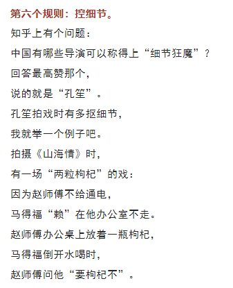 這場戲最初的版本是: 趙師傅主動問馬得福: “要枸杞不? 不要放太多,兩三粒就行。” 馬得福要了。 孔笙覺得不太合理, 于是有了第二個版本: 得福主動問趙師傅: “有枸杞不?我也泡倆。” 孔笙還是覺得不太合理, 于是想了第三個版本: 趙師傅問:“你要枸杞不?” 得?;卮穑骸安灰疑眢w好著呢。” 最終播出時, 我們看到的是第三個版本。 這個版本確實最符合劇情, 因為得福跑了好幾趟都要電不成, 心里那是有氣的, “我身體好著呢”這句話, 配合他臉上不悅的表情, 正好表達(dá)了他的不滿情緒。 孔笙這細(xì)節(jié)摳得, 只能用一個字形容——牛! 09