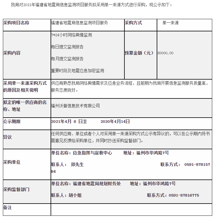 應急指揮與宣教中心福建省地震局信息監(jiān)測項目服務采購公示