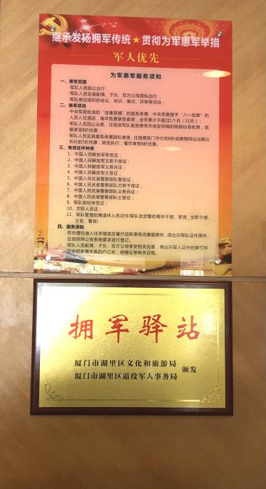今年來,廈門市湖里區(qū)退役軍人事務(wù)局大力推進(jìn)擁軍優(yōu)屬工作,在前期探索的“湖里國(guó)投集團(tuán)、光亮骨科醫(yī)院、愛國(guó)擁軍促進(jìn)會(huì)等企業(yè)、社會(huì)組織、擁軍人物參與”的湖里特色社會(huì)化擁軍新模式基礎(chǔ)上,成立湖里區(qū)首批“擁軍驛站”。 4月中旬,湖里區(qū)退役軍人事務(wù)局、湖里區(qū)文化和旅游局與前期現(xiàn)場(chǎng)考察、綜合評(píng)議通過的天成酒店、廈門君怡酒店簽約,湖里區(qū)首批2家“擁軍驛站”成立并授“擁軍驛站”牌匾。 “擁軍驛站”是湖里區(qū)擁軍優(yōu)屬的又一項(xiàng)新舉措新亮點(diǎn),通過在酒店內(nèi)添置富有湖里區(qū)軍民融合特色和國(guó)防特色的物品擺件、掛畫、雜志等,營(yíng)造濃厚的擁軍優(yōu)屬氛圍,展現(xiàn)了湖里區(qū)擁軍優(yōu)屬優(yōu)良傳統(tǒng),推進(jìn)了軍人、軍屬榮譽(yù)體系建設(shè)。每家“擁軍驛站”每日提供6間擁軍客房,為來湖里區(qū)投資、創(chuàng)業(yè)、就業(yè)、探親、旅居、祭掃的現(xiàn)役軍人、現(xiàn)役軍人配偶、退役軍人和烈士親屬提供酒店食宿掛牌價(jià)約4折優(yōu)惠,以上各類人員憑有效證件、介紹信等每人每次可優(yōu)惠入住驛站3天。至今為止,湖里區(qū)“擁軍驛站”已先后為51名退役軍人提供優(yōu)惠服務(wù),獲得退役軍人和社會(huì)廣泛好評(píng)。