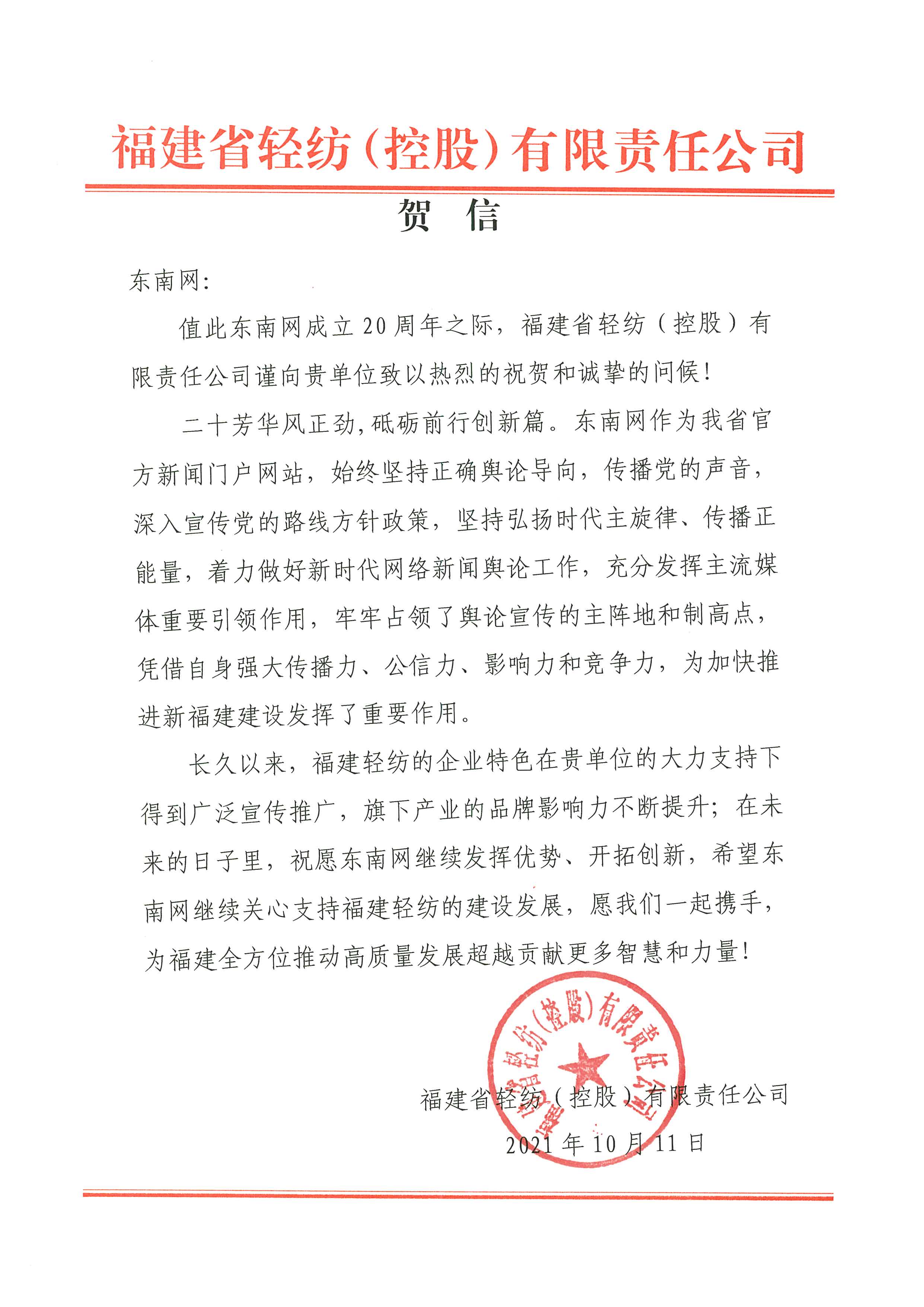 福建省輕紡(控股)有限責任公司賀信