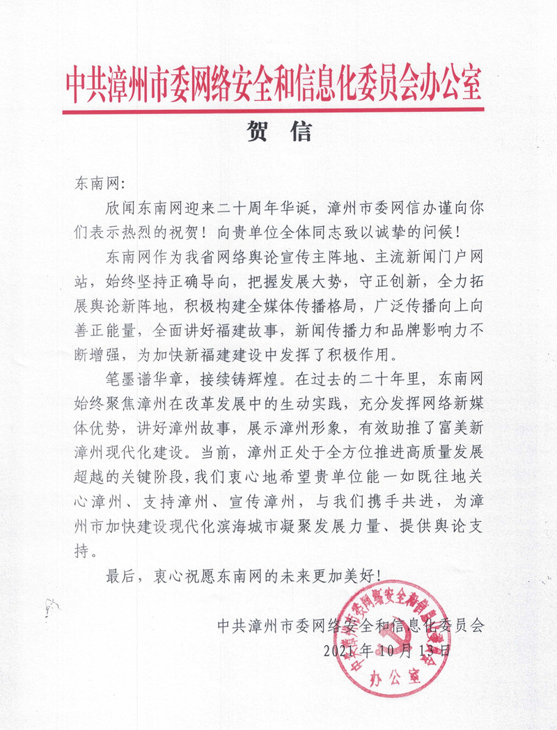 中共漳州市委網(wǎng)絡(luò)安全和信息化委員會(huì)辦公室賀信