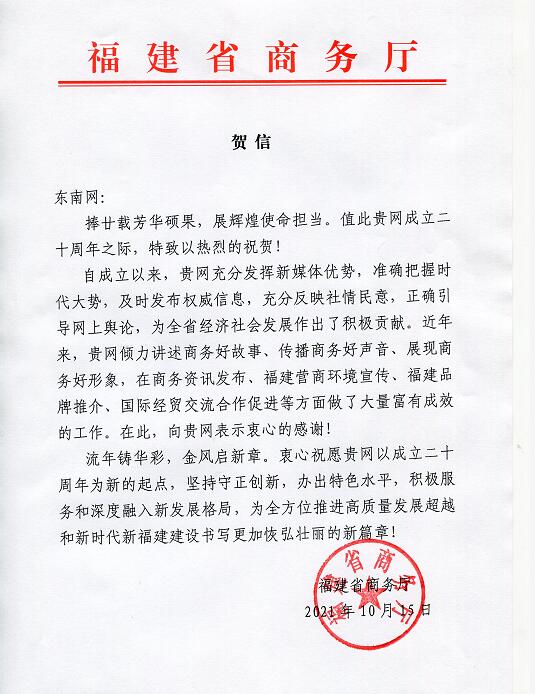 福建省商務廳賀信