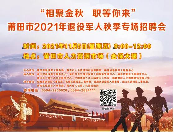 為搭建退役軍人與用人單位就業(yè)互動平臺,促進退役軍人就業(yè),由省退役軍人服務中心、莆田市退役軍人局、莆田市人社局聯(lián)合主辦的莆田市2021年“相聚金秋 職等你來”退役軍人秋季專場招聘會將于11月5日啟動。