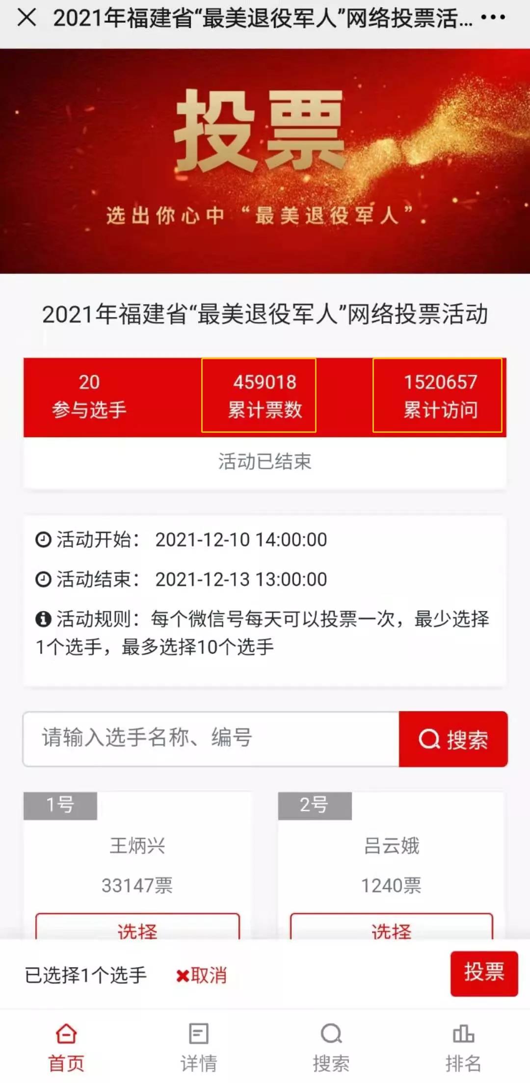 2021年福建省“最美退役軍人”網(wǎng)絡(luò)投票活動圓滿落幕!截止至2021年12月13日13:00,本次投票累計(jì)訪問人次達(dá)到了152萬,總計(jì)投票數(shù)45.9萬。本次微信投票結(jié)果將作為評選的參考,最終評選結(jié)果將于近日公布,不論最終結(jié)果如何,每一位入圍的退役軍人都值得我們尊敬,向你們致敬!