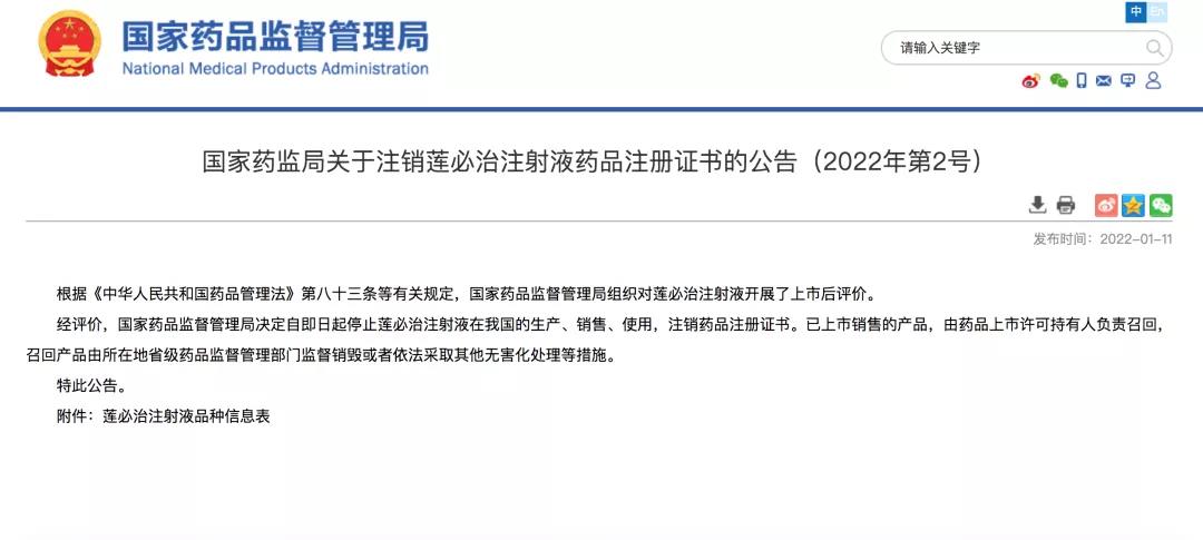 1月11日,國家藥監(jiān)局發(fā)布公告,即日起停止蓮必治注射液在我國的生產(chǎn)、銷售、使用,注銷藥品注冊證書。