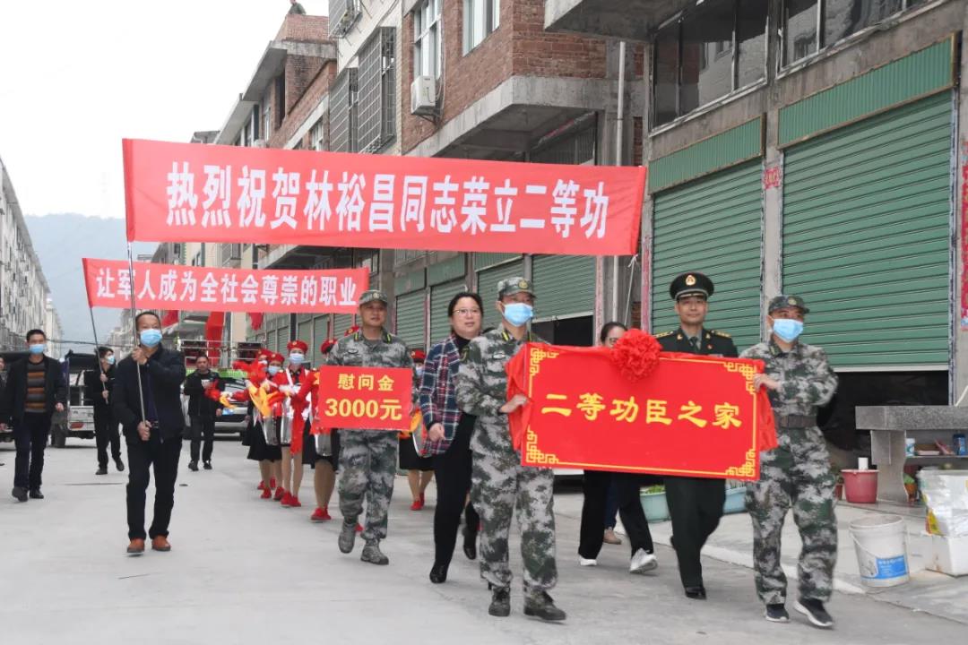 在眾多親朋好友和家鄉(xiāng)媒體的見證下,縣政府副縣長王鴻、人武部政委沈建芳將喜報、慰問金送到了二等功臣林裕昌的父母親手中,并為軍屬們披上功臣綬帶。當工作人員將“二等功臣之家”牌匾送到林裕昌家中時,現(xiàn)場的村民們紛紛稱贊,喝彩聲、掌聲連綿不斷。已93歲高齡的軍屬湯士林奶奶笑得合不攏嘴,更是格外高興,不斷跟街坊鄰居嘮叨:“太高興了,我孫子立功全鎮(zhèn)的人都知道了?!?/p>