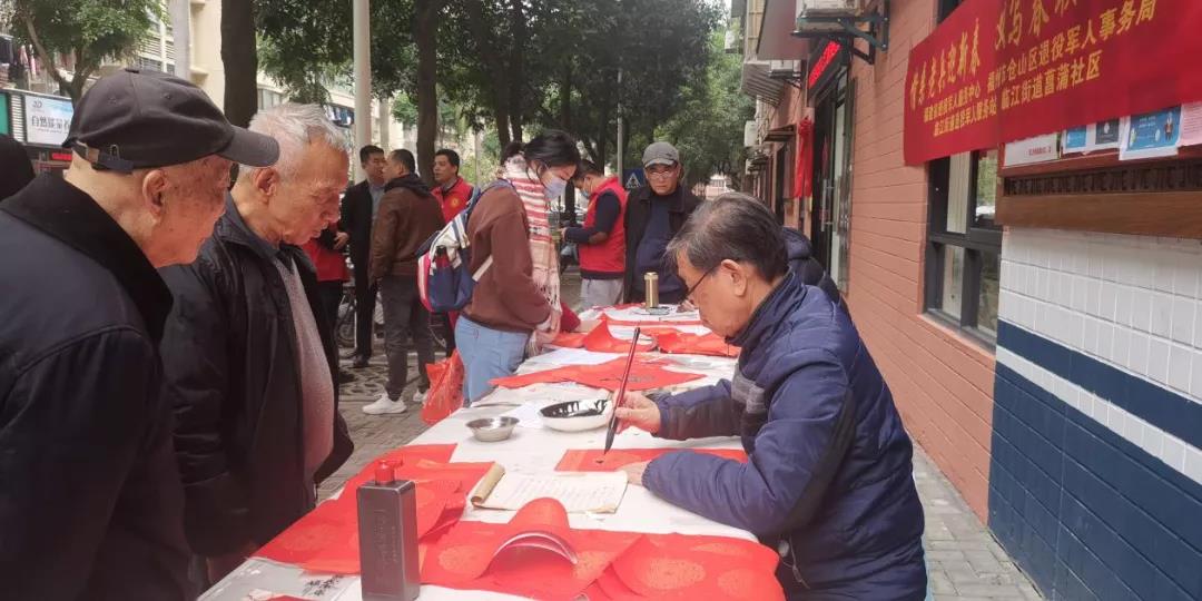 活動(dòng)現(xiàn)場(chǎng),省退役軍人服務(wù)中心、倉(cāng)山區(qū)退役軍人事務(wù)部門(mén)志愿者早早地準(zhǔn)備好紅紙、毛筆、墨汁等用品,特邀書(shū)法家現(xiàn)場(chǎng)揮毫潑墨,寫(xiě)“?!弊趾痛郝?lián),志愿者把寫(xiě)好的春聯(lián)送給退役老兵和其他優(yōu)撫對(duì)象,讓“?!蔽幕哌M(jìn)社區(qū),走進(jìn)老兵心坎上,讓老兵感受濃濃年味。