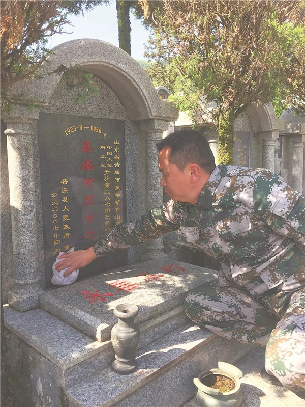 又是一年清明時,將樂縣天閣陵園秦福河烈士墓前,湯順榮俯下身子,用干凈的毛巾小心翼翼地抹去墓碑的灰塵,讓秦福河烈士名字更加熠熠生輝。這是湯家人連續(xù)第72年為親如家人的秦福河烈士祭掃。 湯順榮是將樂縣水南鎮(zhèn)渡頭村村民。1950年,湯順榮的爺爺湯七根、父親湯萬叢將山東籍解放軍戰(zhàn)士秦福河的遺體從金溪河撈起安葬,從那以后,每年清明都會去祭掃。湯七根年齡大了,走不動了,就把祭掃烈士墓的任務(wù)交到了湯順榮的父親湯萬叢手中。1998年,湯順榮從部隊退伍回鄉(xiāng)后,又從父親手中接過重任。湯家三代人光榮接力,72年一直守護。