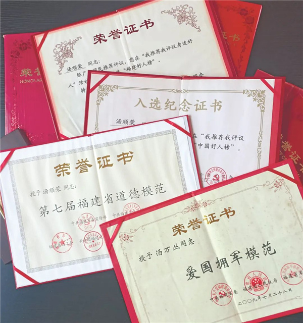 △湯萬叢、湯順榮父子倆榮獲的部分榮譽證書 一句承諾 穿過古色的涵洞,踏著青石條板,可領(lǐng)略到水南渡口舊日的忙碌與繁盛,金溪河波光粼粼,無聲地流向遠方?!熬褪窃谶@里,當年秦福河烈士被我父親抬上來?!闭驹诙煽谶吷系臏槝s指著金溪河上游不遠處的水面說。 時間追溯到1950年初,剛解放不久的將樂縣周邊,國民黨殘兵敗將與地方土匪武裝狼狽為奸,為非作歹,經(jīng)常攪得四鄰八鄉(xiāng)雞犬不寧。 當時,年僅14歲的湯萬叢跟隨其父湯七根在水南渡口擺渡謀生。4月的一天上午,因連降暴雨,金溪河水暴漲。湯萬叢獨自在水南渡口替父親照看竹排。突然,他發(fā)現(xiàn)河上游漂來一個不明“物體”,連忙舉起搭鉤朝那物體探去??拷豢?,大吃一驚,原來是一具身著淺黃色軍裝的遺體,再細看,鋼盔內(nèi)的軍帽上綴著一顆紅色五角星。啊!原來是解放軍叔叔! 想起不久前,自己撐竹排送過一批又一批解放將樂、過河進城的解放軍,他們個個英姿勃發(fā),態(tài)度親切和藹,對老百姓像對待自己的親人一樣。想到這里,湯萬叢不再害怕,他縱身跳入河中,使出渾身力氣將遺體朝岸邊推去,拉到岸邊樹林中隱藏起來,然后跑去找父親。 湯七根正在河對岸的縣城買豬肉,聞訊匆忙趕到河岸邊。父子倆在遺體的軍衣口袋里發(fā)現(xiàn)了一個小記事本,上面寫著:秦福河,25歲,山東省五蓮縣人,中國人民解放軍步兵第二八七團三營八連戰(zhàn)士。湯七根對兒子說:“解放軍就是當年打土豪、分田地的紅軍,我見過,個個都是好人。這位解放軍戰(zhàn)士大老遠從山東來,幫咱們打土匪,讓我們過上太平日子。如今,他英勇犧牲,我們就是他的親人,要找個地方讓他入土為安?!?/p> 就這樣,湯七根拿出為自己準備的棺木,冒著被土匪報復的危險,秘密把這位素不相識的解放軍戰(zhàn)士秦福河安葬在金溪河畔自家的菜地里。 轉(zhuǎn)眼過了中秋,閩贛粵三省交界進行大規(guī)模剿匪,土匪被解放軍一網(wǎng)打盡。想到烈士匆匆下葬,一家人滿懷歉意。于是,湯七根湊足錢,從縣城請來石匠,選用本地最好的“龍池硯石”打制墓碑,把從烈士小記事本上抄下來的內(nèi)容全都刻在墓碑上,并在墓碑的正上方刻上一顆紅五角星,按照當?shù)仫L俗重新給烈士修墳立碑安葬。 1958年春,湯七根臨終前特意叮囑兒子湯萬叢把自己埋到烈士身邊,別讓烈士孤單了。遵從湯七根的囑咐,湯萬叢把父親葬在了烈士墓旁,年年不忘祭祀。 為烈士尋親 改革開放后,百姓富起來了。每年清明,湯萬叢祭祀秦福河烈士的供品也多了起來,有豬肉、烤鴨、河魚、水果和自家釀的米酒。他常跟子女說:“烈士是為我們打土匪犧牲的,我們今天的好日子是他們用生命換來的。他犧牲在我們這里,就是我們的親人,理所當然要盡親人的情分和義務(wù)?!?/p> 后來,村里有人在秦福河烈士墓附近蓋房子,建豬圈,一到下雨天,污水便流入秦福河烈士的墓地。湯萬叢見了心疼,寢食難安。為解決這樁心事,1990年12月12日,他決定為烈士遷墳。將樂縣民政部門得知此事,被他的真情所感動,便從安置優(yōu)撫金中劃出300元,支持這一義舉。 很快,湯萬叢在水南的龍燈山選好一塊地,帶領(lǐng)全家人重新為烈士修墳立碑安葬。 修好烈士新墳當天,湯萬叢要湯順榮記?。骸拔覀円患矣肋h都是秦福河烈士的親人,今后不管再苦再難,你們也要像我和你們的爺爺一樣,守護好烈士墓?!?/p> 2007年,縣里倡導殯葬改革,在將樂縣民政部門的支持下,秦福河烈士墓被遷到天閣陵園革命烈士墓區(qū)。革命烈士墓區(qū)雖然有專人管護,但湯萬叢父子倆年年清明節(jié)依然前往祭掃秦福河烈士墓。 湯萬叢義葬英烈、長年堅持祭掃烈士墓的感人故事在將樂大地傳開后,成為佳話。2009年7月,湯萬叢被福建省委、省政府、省軍區(qū)授予“愛國擁軍模范”榮譽稱號。 為秦福河烈士尋親,一直是湯萬叢的心愿。將樂縣民政部門得知湯萬叢心事后,多次幫助函查,終于查到秦福河烈士有一個親生女兒叫秦洪花居住在天津。聽到這一消息后,湯家人激動不已。 2007年9月28日,秦福河烈士的女兒秦洪花專程從天津來到將樂,祭拜父親,看望和感謝湯萬叢一家人。那天,當秦洪花和她兒子陳波見到湯萬叢時,感動地說:“我們就當您是親舅舅、親舅公了。舅舅、舅公!57年了,這一刻終于盼來了……”母子倆淚如雨下,湯萬叢也老淚縱橫。隨后,兩地親人手捧鮮花,齊刷刷地跪在秦福河烈士墓前祭拜,告慰烈士在天之靈。 當秦洪花含淚告別時,湯萬叢再三安慰她說:“老妹,你住在天津,來往一趟很不容易,我們現(xiàn)在就是一家人,祭掃的事就交到我手上,你就放一百個心吧,我們會世世代代傳承下去的!” 傳承之美 “父親在世時反復對我說,要守好烈士墓,我們的好日子,都是無數(shù)革命先烈用生命換來的。長大后,我就越來越明白這個道理,不僅要去做好這件事,還要讓子孫后代也傳承下去,因為我們不能忘記歷史,幸福真的來之不易。” 受秦福河烈士和家人的影響,湯順榮于1995年入伍,圓了自己當一名軍人的夢想。1998年,湯順榮從部隊退伍還鄉(xiāng),接過年邁父親手中的“接力棒”,繼續(xù)守護好秦福河烈士墓,不僅清明節(jié)必去祭掃,每逢“八一”建軍節(jié)也要去為烈士獻花,清掃落葉、拂去灰塵,為烈士墓碑描紅。 想到秦福河等無數(shù)先烈為人民英勇獻身,以及祖輩、父輩的教誨,這些寶貴
