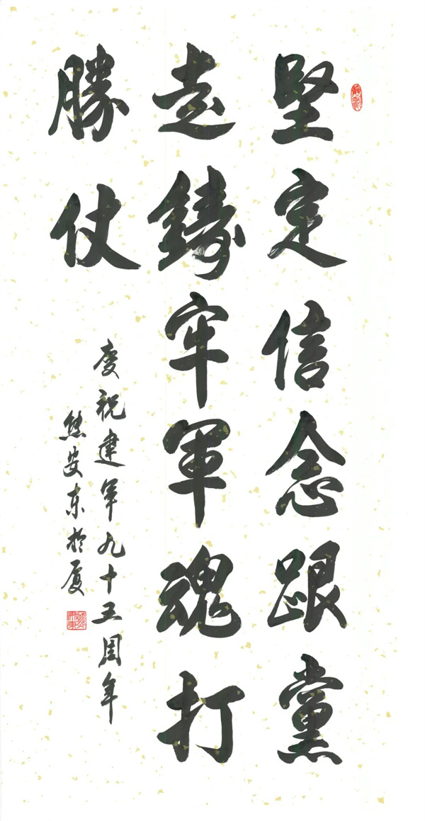 此次書畫展收到了近500幅各類作品,經(jīng)過省書協(xié)和省美協(xié)專家的認真評選,共有150幅書畫作品入展。其中共收到退役軍人及現(xiàn)役軍人書畫作品123幅,32幅入展。此外,軍地有關(guān)領(lǐng)導和福建省愛國擁軍書畫院藝術(shù)家的40幅作品特邀入展。 軍民團結(jié)如一人,試看天下誰能敵!雙擁書畫展已經(jīng)舉辦了三屆,通過書畫藝術(shù)形式,禮贊中國共產(chǎn)黨和中國人民解放軍的光輝歷程和不朽功勛,弘揚中華民族優(yōu)秀傳統(tǒng)文化和紅色基因,展現(xiàn)新時代新福建雙擁工作成就,從而進一步增強廣大軍民砥礪前行的決心和信心,匯聚奮進新征程,建功新時代的磅礴力量。 部分作品展示