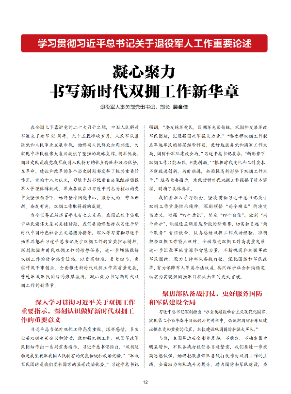 《中國退役軍人》雜志2022年第八期在重要位置推出“學(xué)習(xí)貫徹習(xí)近平總書記關(guān)于退役軍人工作重要論述”專欄,刊發(fā)了退役軍人事務(wù)部黨組書記、部長裴金佳署名文章《凝心聚力書寫新時代雙擁工作新華章》。 凝心聚力書寫新時代雙擁工作新華章 退役軍人事務(wù)部黨組書記、部長 裴金佳 在全國上下喜迎黨的二十大召開之際,中國人民解放軍迎來了建軍95 周年。九十五載崢嶸歲月,人民軍隊緊跟黨和人民事業(yè)發(fā)展步伐,始終與人民群眾血肉相連,為實現(xiàn)中華民族偉大復(fù)興提供了堅強的戰(zhàn)略支撐。擁軍優(yōu)屬、擁政愛民是我黨我軍我國人民特有的優(yōu)良傳統(tǒng)和政治優(yōu)勢,在革命、建設(shè)和改革的各個歷史時期都發(fā)揮了極其重要的作用。黨的十八大以來,習(xí)近平總書記親自決策組建退役軍人管理保障機構(gòu),軍地各級在以習(xí)近平同志為核心的黨中央堅強領(lǐng)導(dǎo)下,始終堅持圍繞中心、服務(wù)大局,守正創(chuàng)新、奮發(fā)有為,雙擁工作取得新的成效。 當(dāng)今世界正經(jīng)歷百年未有之大變局,我國正處于實現(xiàn)中華民族偉大復(fù)興關(guān)鍵時期,我們要始終堅持以習(xí)近平新時代中國特色社會主義思想為指導(dǎo),深入學(xué)習(xí)貫徹習(xí)近平強軍思想和習(xí)近平總書記關(guān)于雙擁工作的重要指示精神,深刻把握新時代雙擁工作的形勢任務(wù),進一步增強做好雙擁工作的使命感責(zé)任感,以更高標(biāo)準(zhǔn)、更大擔(dān)當(dāng)、更實作風(fēng)干事創(chuàng)業(yè),全面推進新時代雙擁工作高質(zhì)量發(fā)展,營造軍政軍民團結(jié)的濃厚氛圍,凝心聚力書寫新時代雙擁工作的新華章。 深入學(xué)習(xí)貫徹習(xí)近平關(guān)于雙擁工作重要指示 深刻認識做好新時代雙擁工作的重要意義 習(xí)近平總書記對雙擁工作高度重視、深懷感情,多次出席雙擁有關(guān)會議和活動,就加強雙擁工作、鞏固軍政軍民團結(jié)作出一系列重要指示。習(xí)近平總書記指出,“雙擁運動是我黨我軍我國人民特有的優(yōu)良傳統(tǒng)和政治優(yōu)勢?!薄败娬娒駡F結(jié)是我們黨和國家的顯著政治優(yōu)勢。”習(xí)近平總書記強調(diào),“要發(fā)揚軍愛民、民擁軍光榮傳統(tǒng),鞏固和發(fā)展軍政軍民團結(jié),匯聚強國興軍強大力量?!薄耙l(fā)揮雙擁工作聯(lián)系軍地軍民的橋梁紐帶作用,更好地服務(wù)黨和國家工作大局、國防和軍隊建設(shè)全局。”習(xí)近平總書記要求,“新形勢下,雙擁工作只能加強、不能削弱?!薄案鶕?jù)時代變化和工作要求,不斷改進創(chuàng)新、與時俱進,全面提高新形勢下雙擁工作水平?!边@些重要指示,為做好新時代雙擁工作提供了根本遵循、明確了具體要求。 我們要深入學(xué)習(xí)領(lǐng)會、堅決貫徹習(xí)近平總書記關(guān)于雙擁工作的重要指示精神,深刻領(lǐng)悟“兩個確立”的決定性意義,增強“四個意識”、堅定“四個自信”、做到“兩個維護”,積極適應(yīng)新發(fā)展階段的新形勢,切實擔(dān)負起“兩個服務(wù)”責(zé)任使命,認真總結(jié)雙擁工作成功經(jīng)驗,準(zhǔn)確把握雙擁工作特點規(guī)律,全面推進雙擁工作高質(zhì)量發(fā)展,進一步匯聚軍地資源和智慧力量,不斷鞏固和加強軍政軍民團結(jié),聚力支持部隊備戰(zhàn)打仗、深化國防和軍隊改革,有力保障軍人軍屬合法權(quán)益,共同維護社會和諧穩(wěn)定,切實為實現(xiàn)強國強軍目標(biāo)做出新的更大貢獻。 聚焦部隊備戰(zhàn)打仗 更好服務(wù)國防和軍隊建設(shè)全局 習(xí)近平總書記深刻指出:“在全面建設(shè)社會主義現(xiàn)代化國家、實現(xiàn)第二個百年奮斗目標(biāo)的歷史進程中,必須把國防和軍隊建設(shè)擺在更加重要的位置,加快建設(shè)鞏固國防和強大軍隊?!?/p> 當(dāng)前,我國周邊安全形勢復(fù)雜,不穩(wěn)定、不確定因素明顯增加,軍隊備戰(zhàn)打仗任務(wù)日趨繁重。我們要進一步提高思想認識,始終把服務(wù)部隊備戰(zhàn)打仗作為雙擁工作的主線,全面助力部隊?wèi)?zhàn)斗力提升,助力國防和軍隊建設(shè),為實現(xiàn)中華民族偉大復(fù)興提供更為堅強的戰(zhàn)略支撐。 要持之以恒地做好軍人安置、家屬就業(yè)、子女就學(xué)方面的工作。“后方”連著“前線”,做好這些工作,解除官兵后顧之憂,能夠有效激勵官兵全力投入練兵備戰(zhàn)。近年來,國防和軍隊改革持續(xù)深化,軍人在退役安置、家屬就業(yè)、子女入學(xué)等方面遇到許多新情況。我們要繼續(xù)毫不松懈、久久為功地做好相關(guān)工作,要充分利用雙擁平臺和優(yōu)勢,積極主動協(xié)調(diào)推進,確保把相關(guān)法規(guī)政策落實到位,要提升能力素養(yǎng),帶著愛心、耐心、細心,下大力解決涉及部隊官兵切身利益的實際問題,讓部隊官兵不為退役安置擔(dān)心、不為家屬就業(yè)分心、不為子女教育憂心,全身心投入到訓(xùn)練備戰(zhàn)上來。 要聚焦“前線”“前沿”與“前哨”,為部隊能打仗、打勝仗提供有力支持。積極適應(yīng)部隊執(zhí)行邊境斗爭、海上維權(quán)等軍事任務(wù)日益頻繁的現(xiàn)實,繼承發(fā)揚擁軍支前優(yōu)良傳統(tǒng),全力做好相關(guān)服務(wù)保障工作,形成部隊練打仗