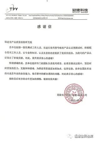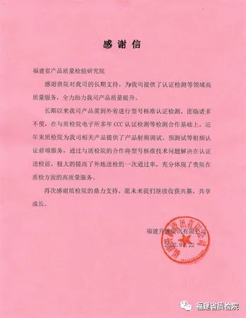 截至目前,福建省質(zhì)檢院電子所依托新獲資質(zhì)能力,已為我省及周邊企業(yè)提供了多批次的5G CCC認證以及BT/Wi-Fi型號核準預測試等新領域的檢測服務,幫助企業(yè)在家門口即可得到及時高效服務,進一步縮短了企業(yè)認證周期,受到多家企業(yè)的一致好評,獲贈多封感謝信。 |