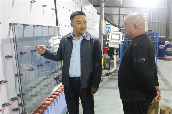陳學林(左一)向劉宗銀了解鋼化玻璃生產(chǎn)情況。尤溪縣融媒體中心供圖 2020年,退役軍人劉宗銀看中西城鎮(zhèn)交通區(qū)位優(yōu)勢,想在當?shù)匦陆ㄤ摶锌詹Aa(chǎn)線項目,但遇到了園區(qū)道路、變壓器增容等方面的問題。陳學林得知后,立即組建專班,靠前服務(wù),溝通自然資源、供電、工信、發(fā)改、公路等部門,通過現(xiàn)場辦公等方式,以“軍人速度”快速推動項目建設(shè)。據(jù)了解,這個項目實現(xiàn)了當年度引進、開工、投產(chǎn)、上規(guī),次年實現(xiàn)產(chǎn)值4000多萬元。