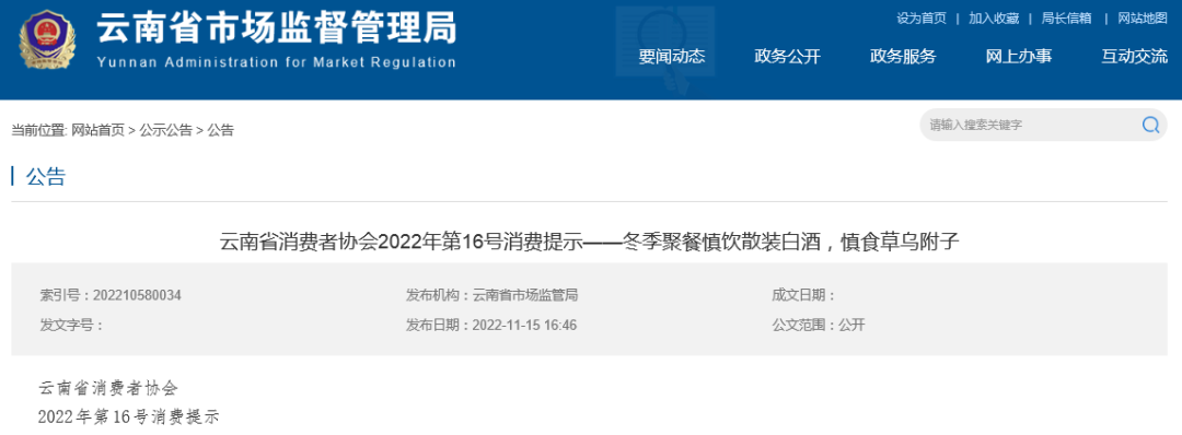 冬季聚餐慎飲散裝白酒,慎食草烏附子 一、消費者要樹立“自己是健康第一責任人”的健康理念,加強食品安全意識,正確選購和飲用白酒。01:選購正規(guī)廠家生產(chǎn)的散裝白酒,購買時查看標簽內容是否齊全,對明顯低于市場價格的散裝白酒要保持高度警惕,不采購、不飲用生產(chǎn)廠家不明、未經(jīng)登記備案的小作坊生產(chǎn)加工的散裝白酒,不要購買、飲用私自勾兌和來源不明的散裝白酒;02:家庭自釀白酒嚴禁對外出售,不要在集體用餐中提供家庭自釀酒;03:農(nóng)村集體聚餐主辦者嚴禁采購無合格檢測報告、生產(chǎn)廠家不明、未經(jīng)登記備案的白酒小作坊生產(chǎn)加工的散裝白酒及自釀酒用于集體聚餐飲用;04:白酒生產(chǎn)經(jīng)營者嚴禁購買、貯存和使用甲醇、工業(yè)酒精等非食品原料。使用醇基液體燃料的各類餐飲服務單位,要加強使用環(huán)節(jié)管理,專人專位管理存放,標貼明顯標識,做好領用登記,嚴禁同白酒混合存放。 二、草烏、附子不是食品!請廣大消費者慎食草烏、附子等毒性中藥材,避免中毒。01:正確認識草烏、附子等毒性中藥材,在無醫(yī)生指導的情況下不要擅自服食,做到不參與、不邀約、不聚眾食用草烏、附子;02:經(jīng)營者應嚴格遵守《中華人民共和國食品安全法》《醫(yī)療用毒性藥品管理辦法》,不以任何方式經(jīng)營以草烏、附子等毒性中藥材為原料的食品(包括自制泡酒)。 |