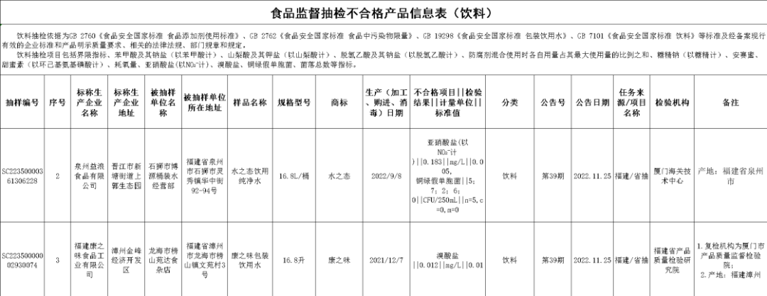 其他污染問題 南安市英都千百味快餐店的盤子(消毒日期為2022年9月22日),陰離子合成洗滌劑(以十二烷基苯磺酸鈉計)不合格,檢驗機構(gòu)為福建省產(chǎn)品質(zhì)量檢驗研究院; 南安市英都千百味快餐店的湯碗(消毒日期為2022年9月22日),陰離子合成洗滌劑(以十二烷基苯磺酸鈉計)不合格、大腸菌群不合格,檢驗機構(gòu)為福建省產(chǎn)品質(zhì)量檢驗研究院; 廈門市同安區(qū)林民珠小吃店的扁食碗(消毒日期為2022年9月22日),陰離子合成洗滌劑(以十二烷基苯磺酸鈉計)不合格,檢驗機構(gòu)為福建省產(chǎn)品質(zhì)量檢驗研究院; 上杭縣瑞仟香飯店的碗(消毒日期為2022年9月24日),陰離子合成洗滌劑(以十二烷基苯磺酸鈉計)不合格、大腸菌群不合格,檢驗機構(gòu)為福建省產(chǎn)品質(zhì)量檢驗研究院; 龍巖市好運通餐飲有限公司的碗(消毒日期為2022年9月26日),陰離子合成洗滌劑(以十二烷基苯磺酸鈉計)不合格,檢驗機構(gòu)為福建省產(chǎn)品質(zhì)量檢驗研究院; 龍巖市好運通餐飲有限公司的杯子(消毒日期為2022年9月26日),陰離子合成洗滌劑(以十二烷基苯磺酸鈉計)不合格,檢驗機構(gòu)為福建省產(chǎn)品質(zhì)量檢驗研究院; 廈門市味友閩南宴文化推廣有限公司的小圓碗(消毒日期為2022年9月23日),陰離子合成洗滌劑(以十二烷基苯磺酸鈉計)不合格、大腸菌群不合格,檢驗機構(gòu)為福建省產(chǎn)品質(zhì)量檢驗研究院; 廈門市湖里區(qū)魚你相伴餐飲店的白方盤(消毒日期為2022年9月26日),陰離子合成洗滌劑(以十二烷基苯磺酸鈉計)不合格、大腸菌群不合格,檢驗機構(gòu)為福建省產(chǎn)品質(zhì)量檢驗研究院; 福州高新區(qū)南嶼倪珊小吃店的瓷碗(消毒日期為2022年10月11日),陰離子合成洗滌劑(以十二烷基苯磺酸鈉計)不合格,檢驗機構(gòu)為福建省產(chǎn)品質(zhì)量檢驗研究院; 福州高新區(qū)南嶼倪珊小吃店的圓盤(消毒日期為2022年10月11日),陰離子合成洗滌劑(以十二烷基苯磺酸鈉計)不合格,檢驗機構(gòu)為福建省產(chǎn)品質(zhì)量檢驗研究院; 福州紅椒香餐飲管理有限公司的筷子(消毒日期為2022年10月17日),陰離子合成洗滌劑(以十二烷基苯磺酸鈉計)不合格,檢驗機構(gòu)為福建省產(chǎn)品質(zhì)量檢驗研究院; 泉州益浪食品有限公司2022年9月8日生產(chǎn)的水之態(tài)飲用純凈水,亞硝酸鹽(以NO2ˉ計)不合格、銅綠假單胞菌不合格,銷售單位為石獅市博源桶裝水經(jīng)營部,檢驗機構(gòu)為廈門海關(guān)技術(shù)中心; 福建康之味食品工業(yè)有限公司2021年12月7日生產(chǎn)的康之味包裝飲用水,溴酸鹽不合格,銷售單位為龍海市榜山苑達食雜店,初檢機構(gòu)為福建省產(chǎn)品質(zhì)量檢驗研究院,復(fù)檢機構(gòu)為廈門市產(chǎn)品質(zhì)量監(jiān)督檢驗院。