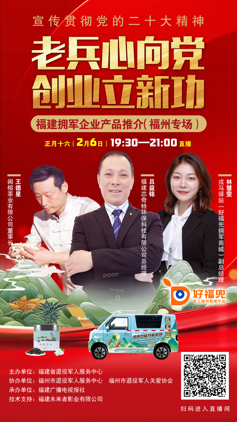 為宣傳貫徹黨的二十大精神,激勵(lì)老兵創(chuàng)業(yè)之路再立新功,福建省退役軍人服務(wù)中心傾力打造“老兵直播專(zhuān)場(chǎng)”,2月6日晚7點(diǎn)30分,福建首場(chǎng)擁軍企業(yè)產(chǎn)品線(xiàn)上推介活動(dòng)。
