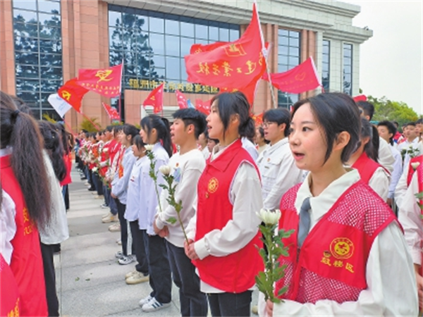 千余名學(xué)生和志愿者參加悼念活動 上午9時,文林山革命英烈紀(jì)念園內(nèi),手持白花的參與者整齊列隊(duì),表情莊嚴(yán)肅穆?!爱?dāng)亦樂犧牲吾身與汝身之福利,為天下人謀永福也!”“就讓你們的槍聲,成為我們婚禮的禮炮吧!”“憑將一掬丹心在,泉下差堪對我翁?!薄顒娱_始,來自福州大學(xué)至誠學(xué)院人文藝術(shù)系的同學(xué)們身著表演服,在紀(jì)念碑前的臺階上進(jìn)行沉浸式角色扮演。他們先后朗誦林覺民《與妻書》片段、徐琛和余哲貞烈士犧牲前留言以及吳石將軍的絕命詩等先烈經(jīng)典名言和詩句。 飽滿的激情和抑揚(yáng)頓挫的語調(diào),點(diǎn)燃了全場熱情,在場1000多名參與者一起跟誦,通過革命先烈的名言,追憶他們的豐功偉績。鏗鏘有力、飽含深情的話語聲,回蕩在文林山的松林間。