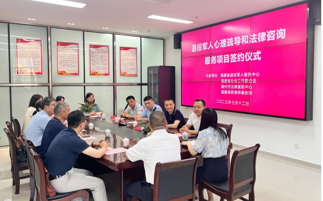 7月12日上午,在省退役軍人事務(wù)廳指導(dǎo)下,在省司法廳大力支持下,省退役軍人服務(wù)中心與省社會工作聯(lián)合會、福州市法律援助中心、福建閩君律師事務(wù)所舉辦“退役軍人心理疏導(dǎo)和法律咨詢服務(wù)項(xiàng)目”簽約儀式。