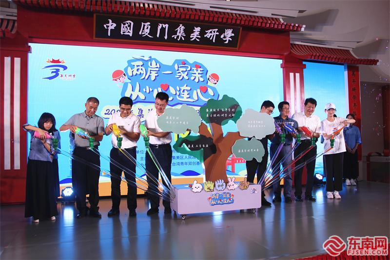 與會領導嘉賓與兩岸營員代表攜手啟動本屆研學營裝置,寓意將對祖國下一代的祝福和愛護傾注在“集美五育之樹”。(東南網(wǎng)記者 李霖 攝) 東南網(wǎng)7月16日報道(記者 李霖 實習生 黃倩怡)7月16日下午,“兩岸一家親 從小心連心”2023年集美區(qū)兩岸研學體驗營開營儀式在廈門(集美)閩臺研學旅行基地總部大樓舉行。210名兩岸青少年營員、親子家庭齊聚集美,共同開啟為期4天3夜的研學體驗營活動,再譜兩岸交流融合新篇。 本次活動由廈門市人民政府臺港澳辦事務辦公室指導,廈門市集美區(qū)人民政府主辦,聚融壹家臺灣青年雙創(chuàng)基地承辦。 全新升級 三個主題研學營同步啟動 一直以來,集美區(qū)充分發(fā)揮獨特對臺優(yōu)勢,積極打造兩岸融合發(fā)展“集美樣本”,努力把“集美研學”建設成為兩岸青少年心靈契合的第一課堂。今年,集美區(qū)兩岸研學體驗營迎來了第七個年頭,時隔3年再次舉辦,研學營再次擦亮集美研學“金字招牌”,也迎來全新升級。 從營隊體量上,研學營圍繞《兩岸青年“青春集美”》《集美學村申遺》《集美五育家庭》三大主題,分為兩岸青年大學生主題研學營、兩岸青少年主題研學營、兩岸親子主題研學營。 今年,營隊天數(shù)還從3天升級到4天,為兩岸營員創(chuàng)造更充沛的時間。值得一提的是,以新舊營員80%與20%的配比,此次有140位臺灣島內營員遠道而來,其中近80名是新朋友。 今年2月,集美CAZ中央活力區(qū)橫空出世。為更好地助力集美中央活力區(qū)打造,激活兩岸青年青春能量,此次體驗營首次開設兩岸青年大學生主題研學營,邀請68名兩岸青年大學生將親身體驗集美中央活力區(qū)的發(fā)展,深入感受集美青年發(fā)展友好型城區(qū)的業(yè)態(tài)。據(jù)悉,以此為范本,集美也將常態(tài)化推動年輕化研學及文旅特色品牌,吸引更多兩岸青年大學生相會集美、交流研學。 今年是集美學校創(chuàng)辦110周年,也是集美學村命名100周年。為助力集美學村申遺,本次研學營的兩岸青少年將化身為集美學村“兩岸小小申遺官”,開啟一場充滿歷史與思辨的研學旅程,深入探究集美學村申遺元素,為集美學村申遺貢獻自己的智慧與力量,同時將嘉庚精神根植心中。 以“解決親子家庭教育問題”為初衷,本次兩岸親子主題研學營將圍繞“兩岸五育家庭”和陳嘉庚先生教育遺產(chǎn)進行深入研學深入體驗和主題內容規(guī)劃設置,打造親子研學品牌“集美五育研學”,推出“德智體美勞”五育主題研學課程,讓兩岸家庭共同學習與成長。
