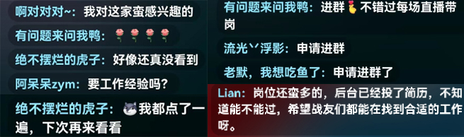 此次活動是省退役軍人事務廳舉辦的第二場面向全省退役軍人及軍屬的“直播帶崗”招聘活動。本場活動邀請高級職業(yè)指導師在線現(xiàn)場解答。特別邀請專業(yè)律師做客直播間,現(xiàn)場解讀勞動合同及合同簽訂過程中的注意事項等相關法律知識,為退役軍人求職保駕護航。 直播間設置退役軍人優(yōu)惠政策專區(qū)、崗位投遞專區(qū)、互動專區(qū),可實現(xiàn)看直播,小程序一鍵投遞簡歷,有問題,即時問,在線答。 直播深受廣大退役軍人歡迎,期間,戰(zhàn)友們熱情高漲,紛紛評論留言: