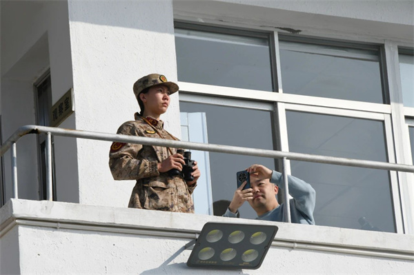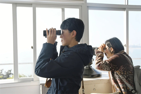 記者們紛紛模仿哨兵,利用望遠(yuǎn)鏡察看過往船只,并不時拍照留念,尋找適宜傳播的信息。