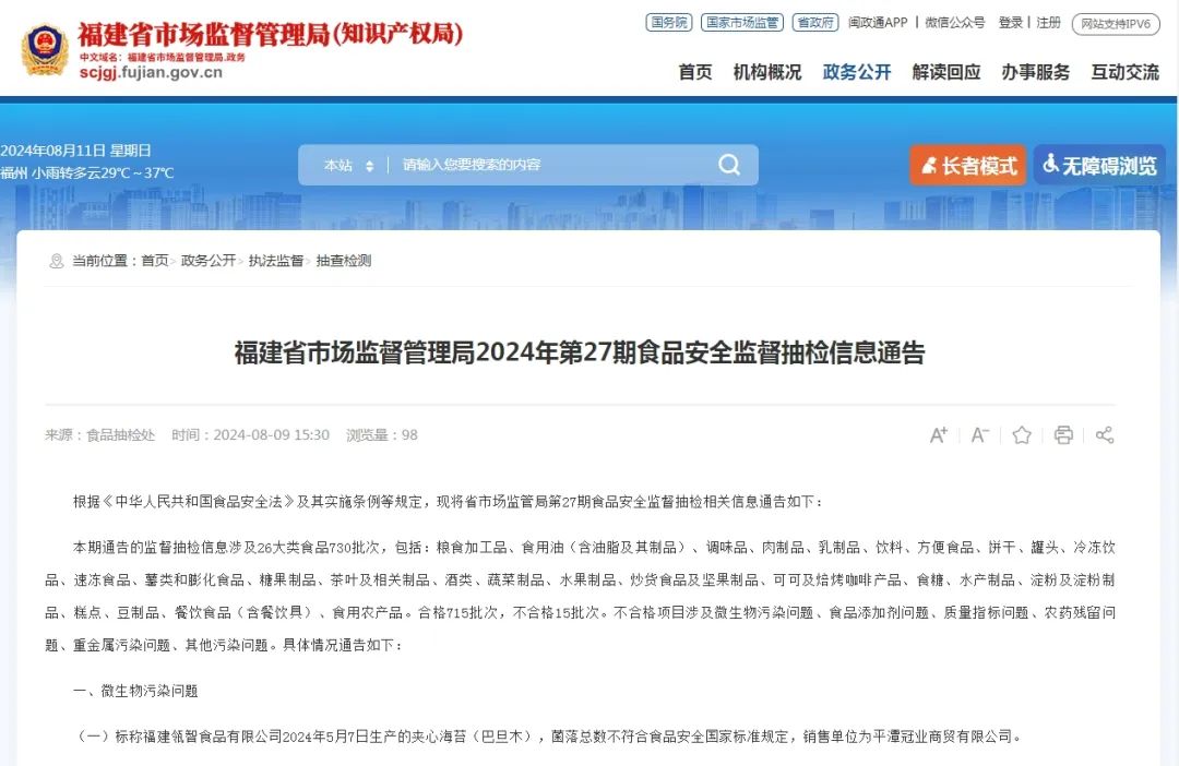 近日,福建省市場監(jiān)管局公布第27期食品安全監(jiān)督抽檢相關(guān)信息通告。 本期通告的監(jiān)督抽檢信息涉及26大類食品730批次。其中合格715批次,不合格15批次。不合格項目涉及微生物污染問題、食品添加劑問題、質(zhì)量指標(biāo)問題、農(nóng)藥殘留問題、重金屬污染問題、其他污染問題。