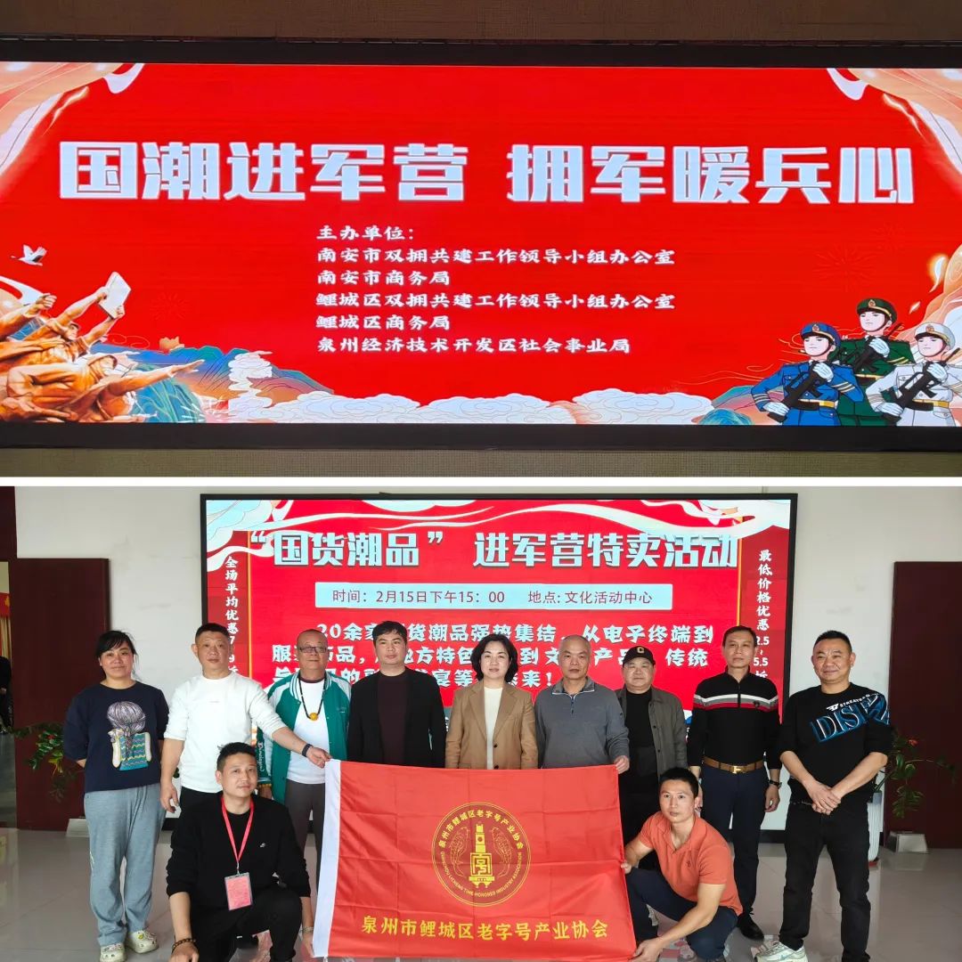 2月15日,泉州市鯉城區(qū)雙擁共建工作領(lǐng)導(dǎo)小組辦公室、鯉城區(qū)商務(wù)局、南安市雙擁共建工作領(lǐng)導(dǎo)小組辦公室、南安市商務(wù)局、泉州經(jīng)濟技術(shù)開發(fā)區(qū)社會事業(yè)局聯(lián)合相關(guān)品牌企業(yè)開展“國貨潮品”進軍營特賣活動。