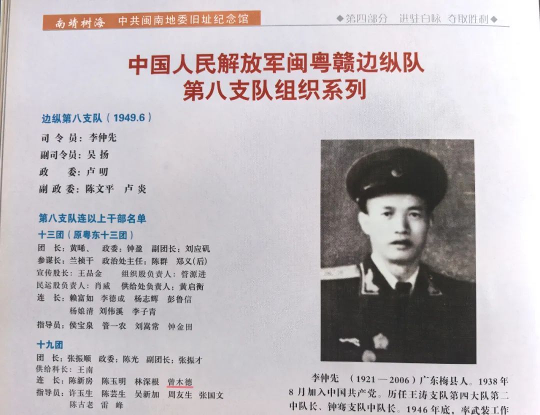 曾木德的養(yǎng)父曾水港是一名地方工作隊(duì)員,負(fù)責(zé)在平和縣內(nèi)為游擊隊(duì)秘密傳遞情報(bào)、運(yùn)送物資及軍需用品。在養(yǎng)父的教育影響下,曾木德也萌發(fā)了跟隨共產(chǎn)黨參加革命的理想。 “我們當(dāng)時(shí)沒(méi)有吃,條件非常艱苦,槍械又落后,自己打草鞋,很久才發(fā)一套軍裝?!被貞浧鹜拢镜抡f(shuō),為避開(kāi)國(guó)民黨軍隊(duì)襲擊,他們常年住在深山密林,走在崎嶇山路。主要以南勝歐寮村和云霄烏山為根據(jù)地,在南靖、平和、漳浦宣傳革命政策、攻打國(guó)民黨陣地,也曾被調(diào)到廣東饒平、大埔、龍巖永定、江西等地支援。 “將近六年的時(shí)間沒(méi)蓋過(guò)棉被,一直都在山上打游擊?!闭劶叭胛槌跣?,曾木德表示,由于養(yǎng)父的秘密身份暴露,在平和縣霞寨圩被國(guó)民黨反動(dòng)派逮捕后殘酷殺害。全家得訊后極度悲傷憤怒,但敵人的殘暴沒(méi)有動(dòng)搖他革命的信念。他懷著家仇國(guó)恨,委托姐妹和鄉(xiāng)親們簡(jiǎn)單處理養(yǎng)父后事,便返回部隊(duì)繼續(xù)戰(zhàn)斗。1983年,曾水港被追認(rèn)為革命烈士。