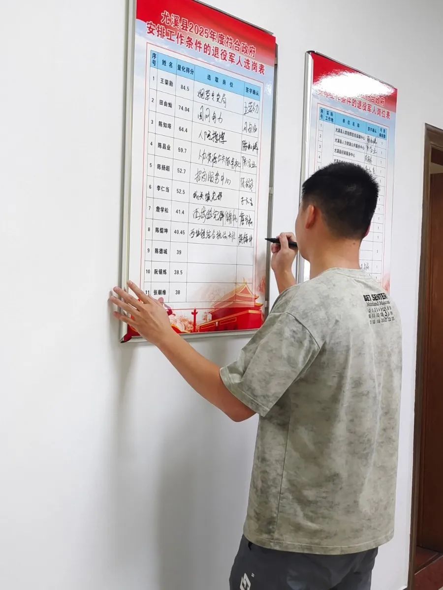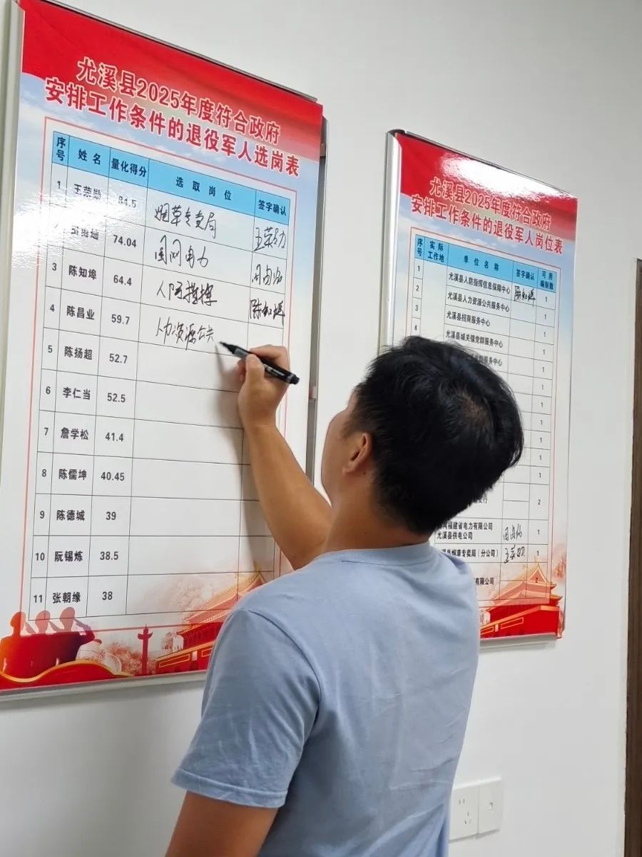 選崗會上,轉(zhuǎn)業(yè)軍士們嚴格依據(jù)量化評分結(jié)果,按分數(shù)從高到低依次選崗,并現(xiàn)場簽字確認??h駐縣委政法委紀檢監(jiān)察組對全過程進行監(jiān)督,確保選崗工作陽光透明、公平公正,讓每位軍士都能在公開的環(huán)境中安心選擇。 清流縣 近日,三明市清流縣2025年度符合政府安排工作退役軍士“陽光安置”選崗工作圓滿完成。 清流縣民政和人力資源社會保障局嚴格落實《退役軍人安置條例》,充分挖掘安置潛力、有效拓寬安置渠道,分別從縣直單位、鄉(xiāng)鎮(zhèn)、國網(wǎng)等精選出多個崗位,供退役軍士選擇。嚴格按照量化評分排名依次進行選崗,5名退役軍士順利完成選崗。 尤溪縣 8月19日上午,三明市尤溪縣召開2025年度符合政府安排工作退役軍人公開選崗會。