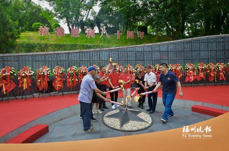 社會(huì)各界人士敬獻(xiàn)鮮花。 深切緬懷 燃傳承火種 佩戴起特制的抗戰(zhàn)勝利80周年紀(jì)念徽章,在紀(jì)念墻上鄭重簽名,與采集來的火種合影留念……8月31日8時(shí)許,福州抗日志士紀(jì)念墻前已是人頭攢動(dòng),早早來到這里的人們,以各種方式表達(dá)崇敬之情。 凝視福州抗日志士紀(jì)念墻,墻上8564個(gè)名字熠熠生輝,每一個(gè)名字背后,都是一位在民族危亡之際挺身而出的抗日志士,都有著一段可歌可泣的英雄故事?!拔腋赣H是抗日志士鄭其土?!编嵎礁稍诟赣H名字旁貼上小小的五星紅旗,“這是告慰先人的一種方式,我們沒有忘記他們,大家都沒忘記他們!”記者看到,許多抗日志士姓名旁都貼上了小小的五星紅旗。 戴著紀(jì)念徽章的兩位抗日志士——97歲姜汝煥和101歲陳世明的到來,吸引了眾人的目光?!昂芨吲d,看到很多熟人。”陳世明笑呵呵地拿出早已寫好的兩張中英文題字贈(zèng)與福建省閩浙贛邊區(qū)革命史研究會(huì)會(huì)長凌冰。一張寫著“大力弘揚(yáng)偉大抗戰(zhàn)精神”,一張寫著“銘記歷史 緬懷先烈”,這是老人對后輩的諄諄囑托。 9時(shí)03分,穿透時(shí)空的號角聲響起。這號角,是告慰,亦是召喚,喚醒人們共同的歷史記憶?!皠倮亢推健o(jì)念中國人民抗日戰(zhàn)爭暨世界反法西斯戰(zhàn)爭勝利80周年活動(dòng)”在號角聲中拉開帷幕。隨后,全場肅立,《義勇軍進(jìn)行曲》的激昂旋律回蕩在紀(jì)念園上空,嘉賓們向福州抗日志士紀(jì)念墻行注目禮,用最莊重的方式致敬英烈。 活動(dòng)現(xiàn)場,工作人員向抗日志士姜汝煥和陳世明獻(xiàn)花;主辦方及參與單位代表向紀(jì)念墻敬獻(xiàn)花籃并整理綬帶。朵朵鮮花寄托哀思,條條綬帶承載敬意,訴說著后人們對前輩先烈的深切緬懷。 抗戰(zhàn)的精神需要薪火相傳。現(xiàn)場大屏幕上播放的“薪火八閩”采集視頻,帶領(lǐng)大家回顧1個(gè)月來的火種采集歷程——從福州八一七烈士墓到福建省閩浙贛邊區(qū)革命紀(jì)念碑、福建省閩粵贛邊區(qū)革命紀(jì)念碑,從閩侯大湖抗戰(zhàn)遺址到陳紹寬上將故居、福州解放紀(jì)念碑、福州長江支隊(duì)紀(jì)念園,每一處都是一段悲壯史詩,每一簇火苗都是一粒不滅的精神種子。 在眾人注視下,抗日志士姜汝煥和陳世明從火種臺引出火種,并為9位抗日志士后人點(diǎn)燃火炬,再由他們共同執(zhí)火炬點(diǎn)燃“抗戰(zhàn)精神傳承長明火”。跳躍的火焰升騰而起,象征著無數(shù)抗日志士用鮮血和犧牲鑄就的抗戰(zhàn)精神將在一代又一代后人手中永續(xù)傳承、永不熄滅。