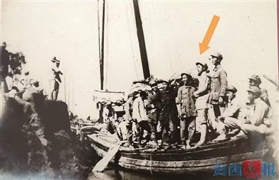 渡江戰(zhàn)役期間,陳榮珠(箭頭指向者)站在船頭。受訪者供圖
