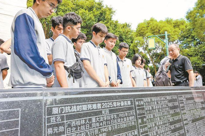 日前,廈門(mén)市中學(xué)生在五通燈塔公園聆聽(tīng)英烈故事,觀看廈門(mén)抗戰(zhàn)時(shí)期死難者名錄碑及2025年補(bǔ)錄名單。(唐光峰 攝)