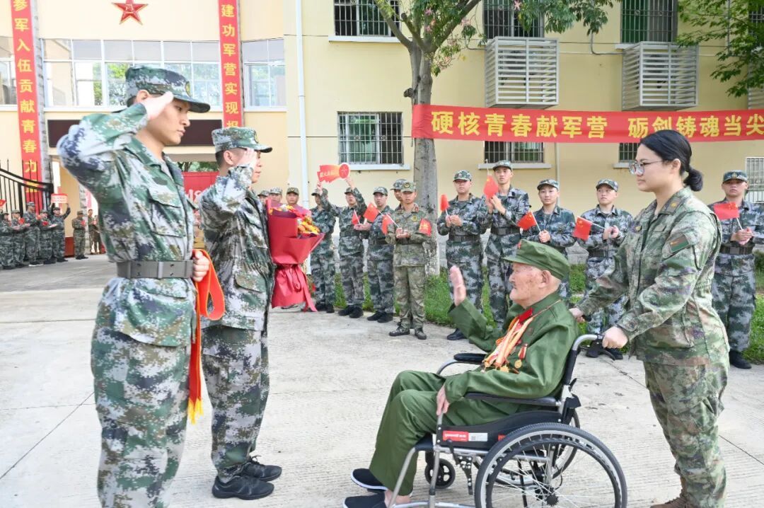 退役軍人蔡澤恩帶領(lǐng)全體同學(xué)面向國旗宣誓:“愿以吾輩之青春,捍衛(wèi)盛世之中華”,鏗鏘誓言激發(fā)濃濃愛國情。