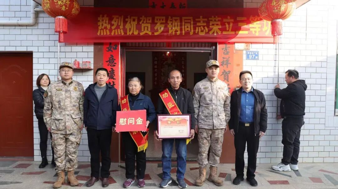12月26日,三明市明溪縣城關鄉(xiāng)、蓋洋鎮(zhèn)鑼鼓喧天、鞭炮齊鳴,由縣人武部、縣民政和人力資源社會保障局(縣退役軍人事務局)組成的送喜報隊伍,深入城關鄉(xiāng)坪埠村,蓋洋鎮(zhèn)蓋洋村、楊地村、常坪村,為4戶榮立三等功的現(xiàn)役軍人家庭送去立功喜報,讓軍人軍屬共享榮耀時刻,在全縣營造“一人立功、全家光榮”的濃厚氛圍。 伴隨著送喜鼓點與鞭炮聲,送喜報工作隊先后抵達各立功軍人家中。工作隊為軍人家屬佩戴上象征榮譽的綬帶,宣讀立功喜報,介紹軍人在部隊的優(yōu)異表現(xiàn)和立功事跡,并將慰問金送到家屬手中。軍人家屬們難掩激動與自豪之情,紛紛表示將繼續(xù)做好軍人的堅強后盾,鼓勵親人在部隊安心服役、刻苦訓練。