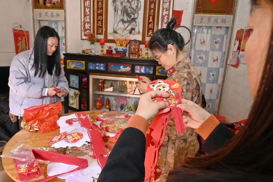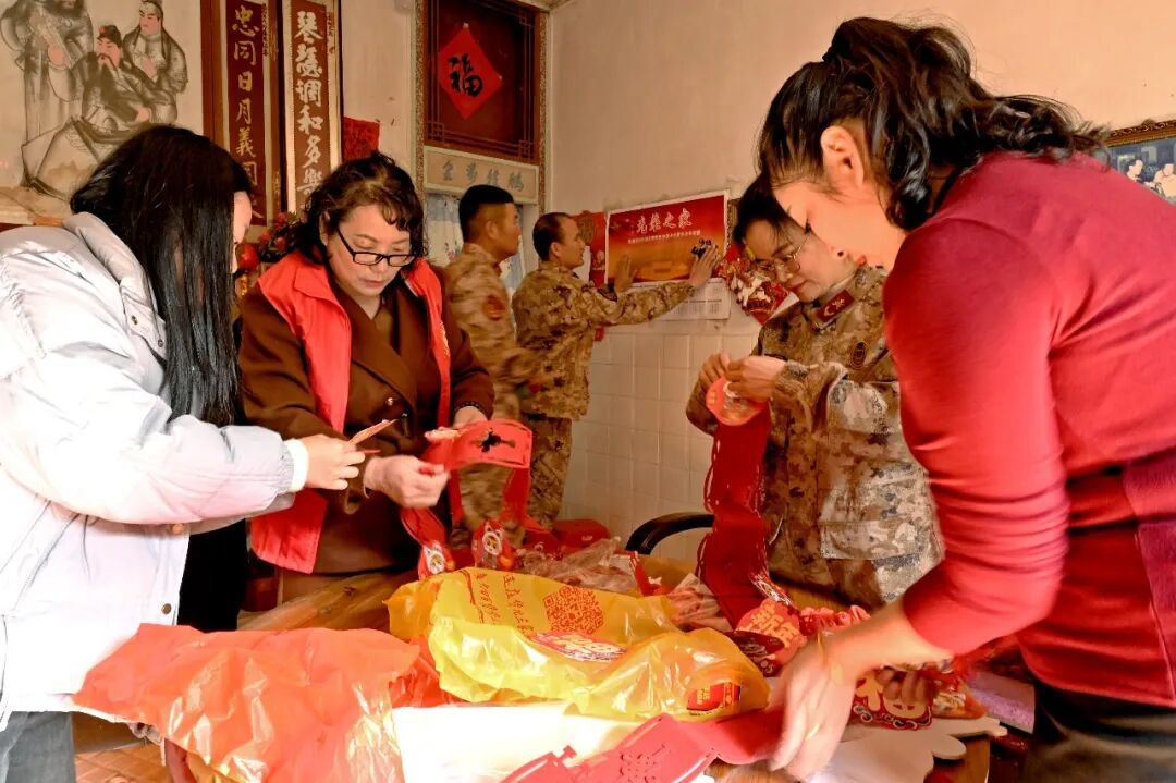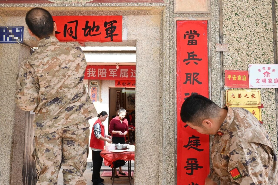走訪人員一進門,便紛紛行動起來:有的懸掛“我陪軍屬過大年”橫幅,有的更換破舊“光榮之家”牌匾,有的張貼紅彤彤的福字與春聯(lián),院中還掛起了象征團圓的小紅燈籠。沒多久,小院被點綴得喜氣盈盈。