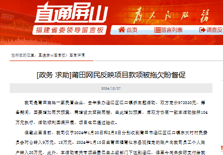 近日,莆田一企業(yè)在《直通屏山》反映,其于2023年承辦涵江區(qū)江口鎮(zhèn)某主題文化活動,至今仍有57萬元經(jīng)費未結(jié)清,導(dǎo)致供應(yīng)商貨款、工人工資及員工薪酬長期拖欠。